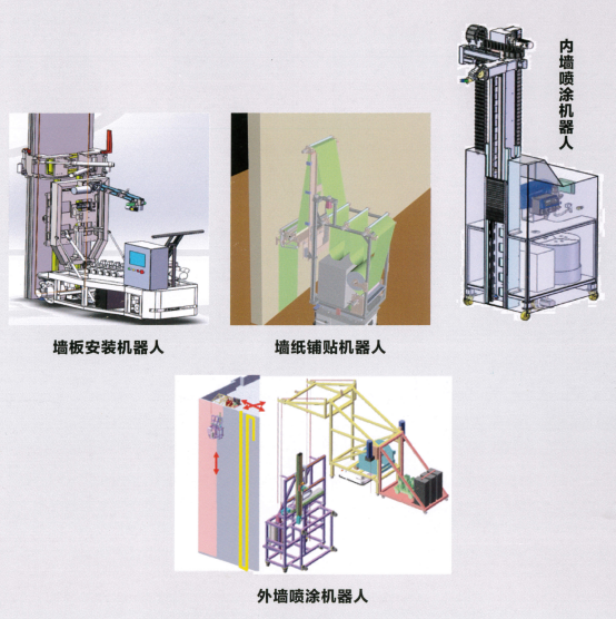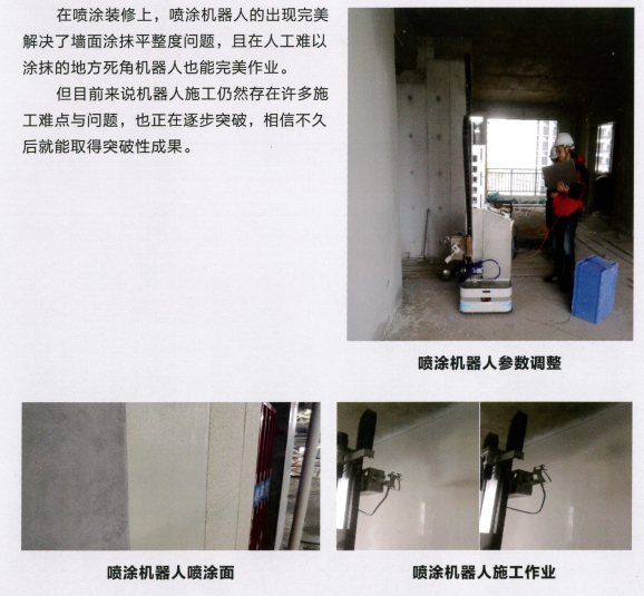 在墙面施工上,喷涂机器人取得成果较高。在通过墙板安装机器人将墙板放置指点位置安装后,需克服温度、湿度、风力、喷射强度等多种因素,完成底漆、中涂漆、面漆的均匀全自动喷涂作业。