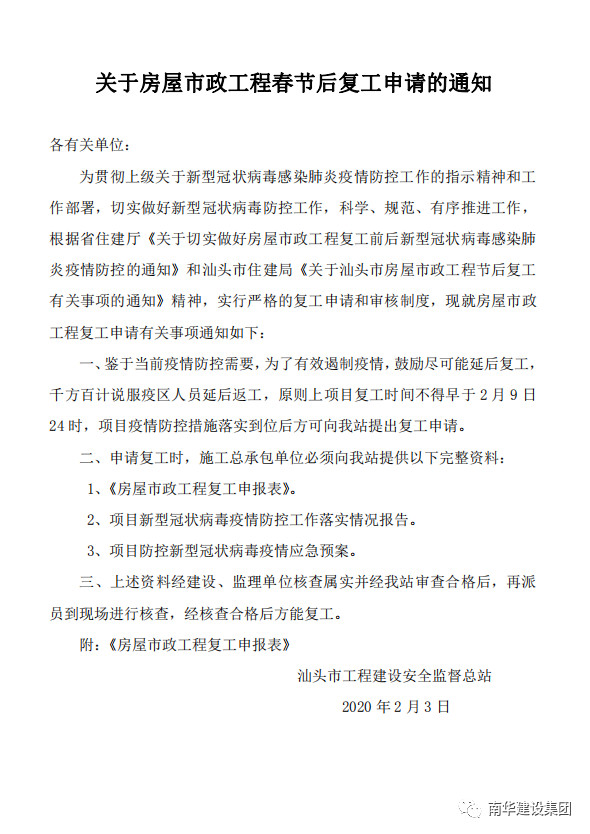 关于汕头市房屋市政建设工程节后复工有关事项的通知>>
