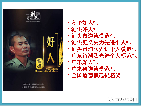 曾雄先生多年来坚持见义勇为、助人为乐,其事迹广为传颂,先后获得“汕头好人”、“广东好人”、“广东省道德模范”、“全国道德模范提名奖”等。