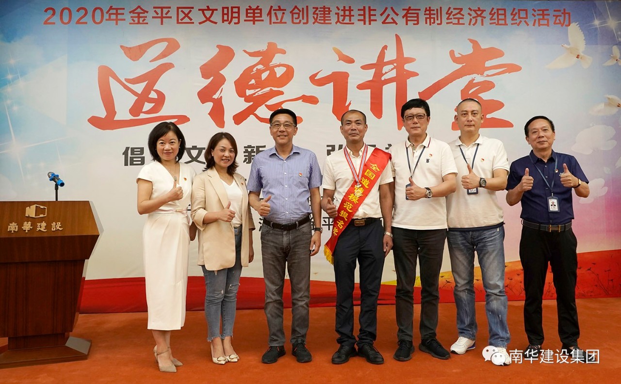 2020年7月3日下午,文明单位创建进非公有制经济组织活动在金平区文明办的指导下,由南华建设集团与金平区工商联联合开展“道德讲堂”活动,邀请了“全国道德模范提名奖”获得者曾雄先生作为主讲嘉宾,集团员工及到场代表感受学习“平民英雄”和“凡人善举”。