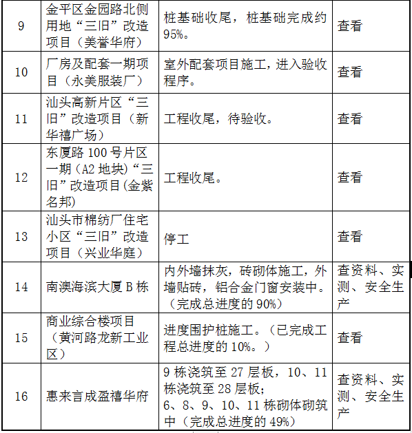 为强化建筑起重机械安全监管工作,保障建筑施工安全生产形势稳定,根据汕头市住建局文件通知,针对在建工程建筑起重机械安全专项检查,我集团公司予以积极配合,对各在建工程项目建筑起重机械进行自查自纠,塔吊、施工电梯等起重机械设备的实体检查、日常保养记录、运行记录、交接班记录、操作人员持证上岗、安全交底及定期保养情况均能按规定要求落实实施,确保使用安全。