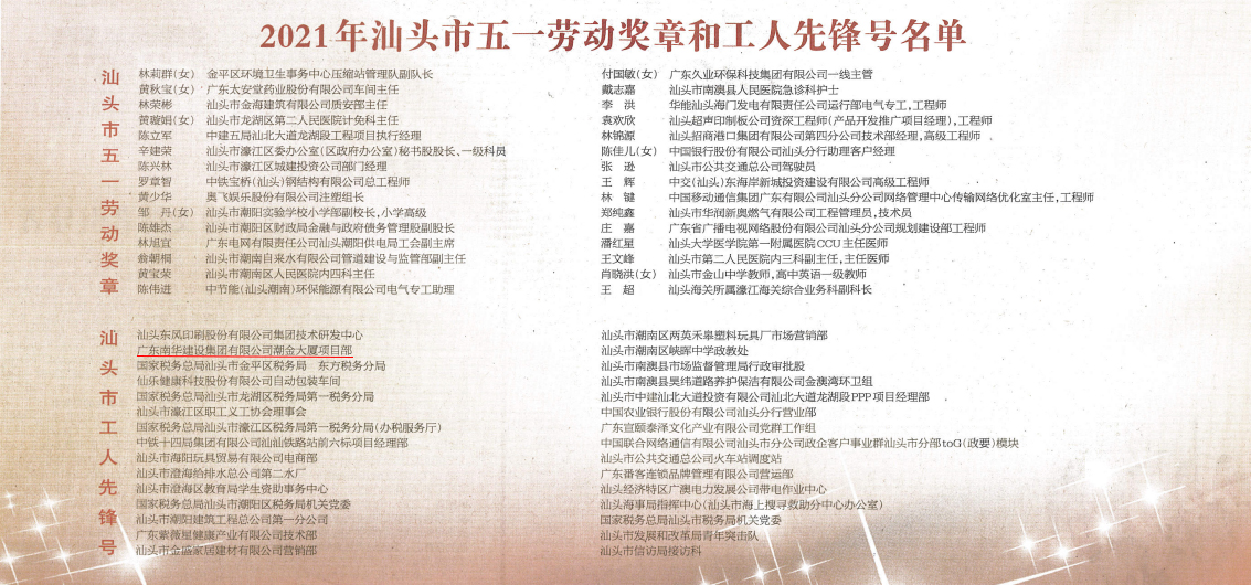 “五一”国际劳动节来临之际,4月30日下午,市委市政府在市委会议中心大会堂召开汕头市庆祝“五一”国际劳动节大会。南华建设集团“潮金大厦项目部”荣获汕头市 “工人先锋号”称号!